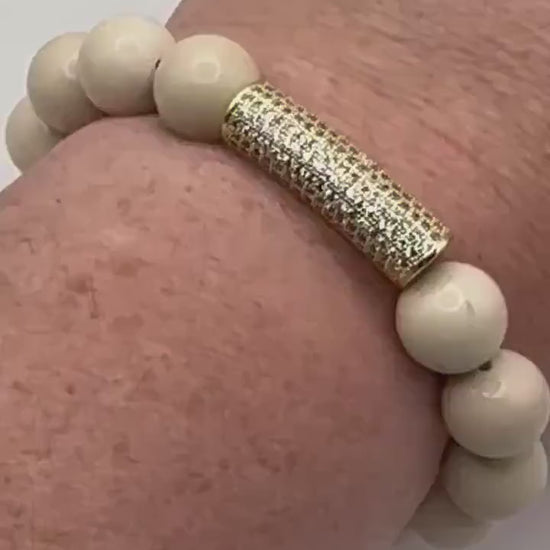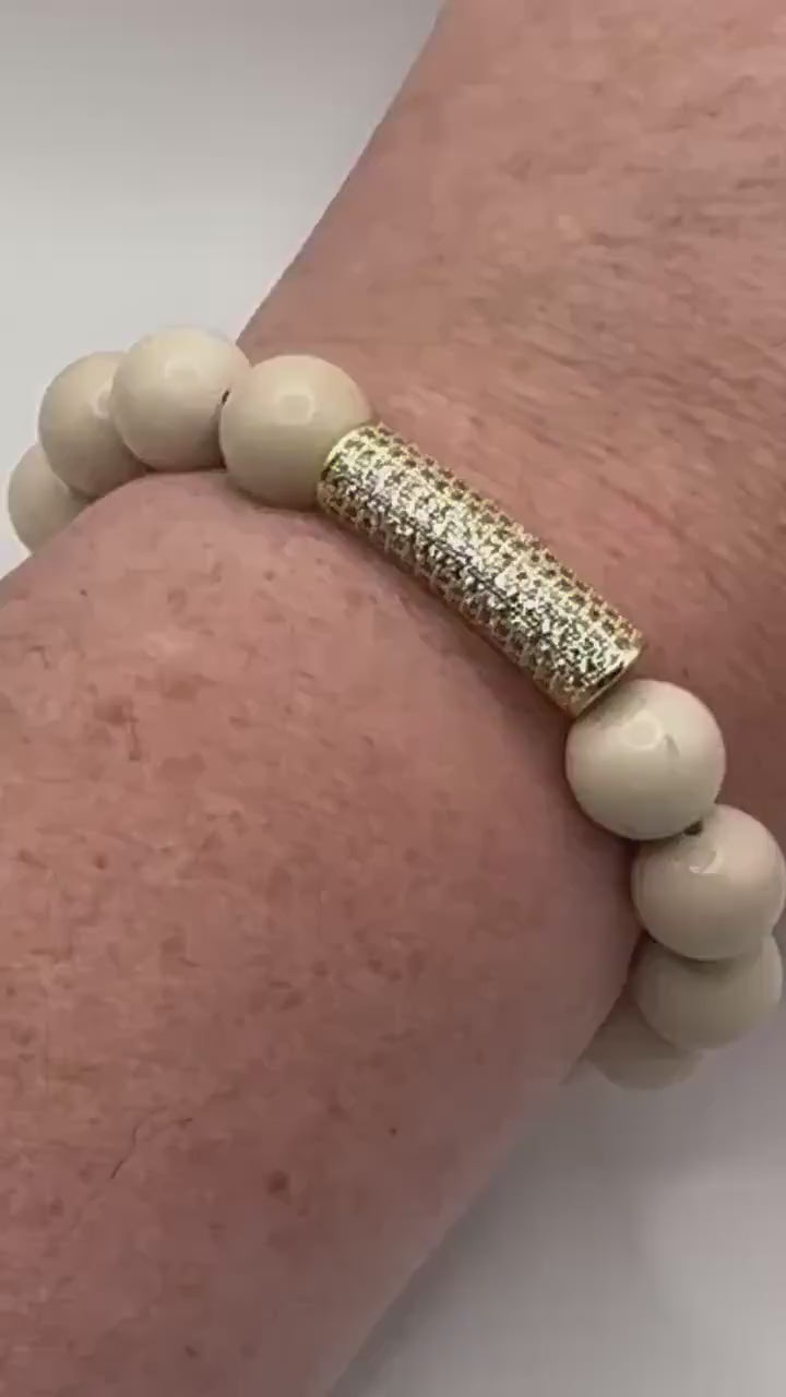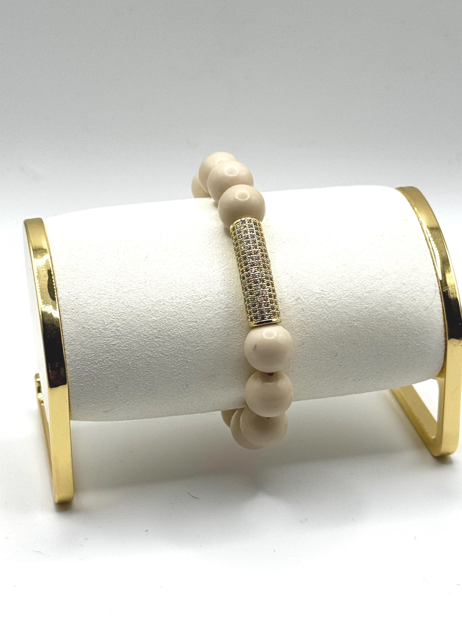 Add effortless elegance to your style with this handmade cream beaded bracelet, featuring a sparkling gold pavé bar charm.