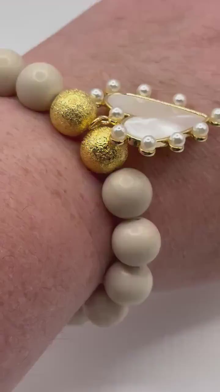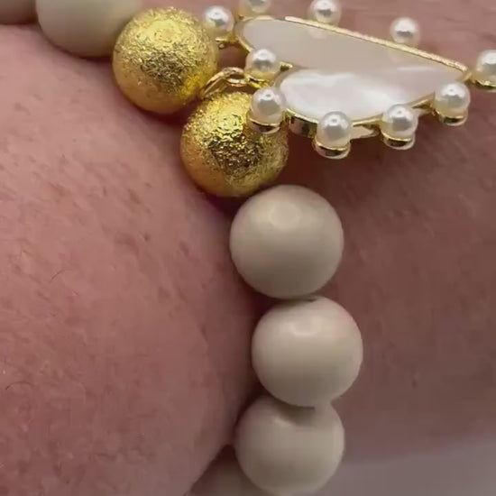 Featuring smooth neutral-toned beads, shimmering gold accents, and a beautifully crafted mother-of-pearl heart charm edged with delicate pearls, this stretch bracelet is the perfect blend of sophistication and charm. Whether worn alone or stacked, it effortlessly complements both casual and dressy outfits.