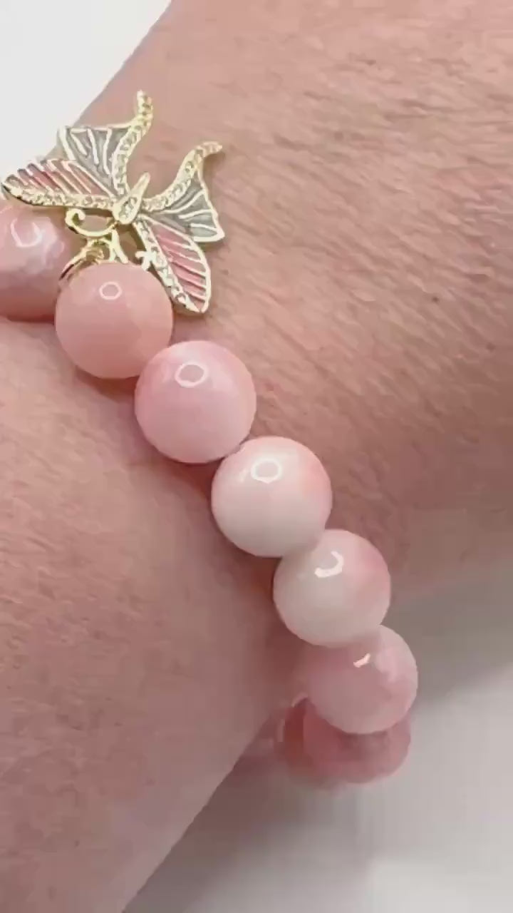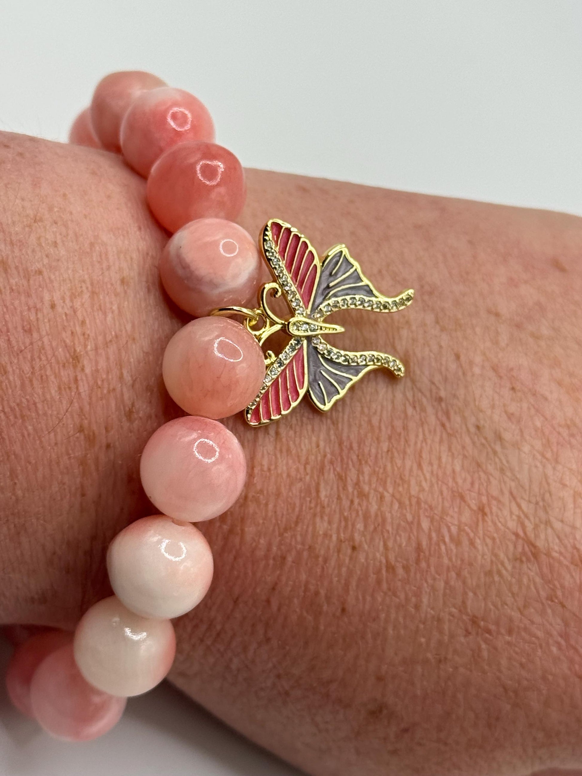 Delicate and dreamy, this handmade bracelet features faceted pale pink beads paired with a sparkling butterfly charm in gold settings. The soft blush tones and shimmering butterflies create a romantic, feminine look that's perfect for any occasion. With its stretch design, it's easy to slip on and off, making it a lovely everyday piece or a thoughtful gift for someone special.